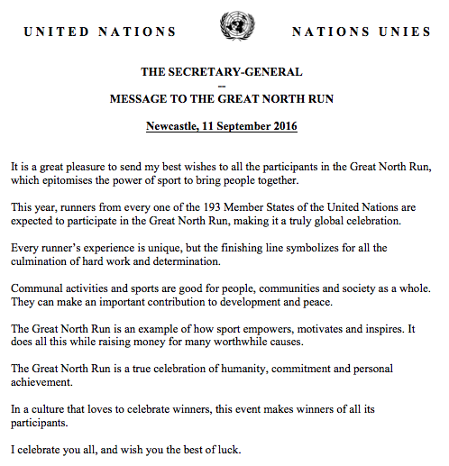 UNITED Nations Secretary General Ban Ki-moon has praised the Great North Run, describing the half marathon as a ‘true celebration of humanity, commitment and personal achievement'.