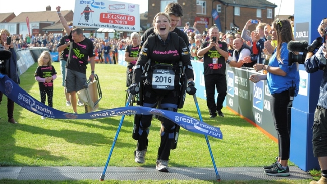 Claire, from Leicestershire, was paralysed from the chest down in a riding accident in 2007 but became the first person to complete a marathon wearing the revolutionary ‘ReWalk' suit in 2012.