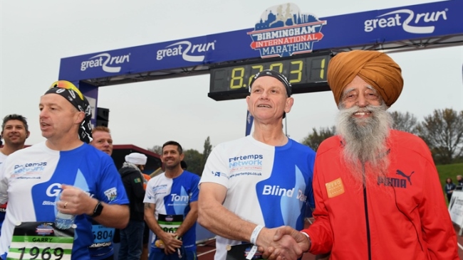 Fauja Singh with Blind Dave Heeley at the 2017 Birmingham International Marathon