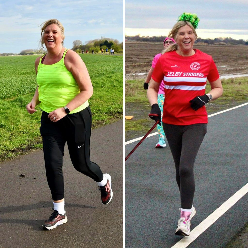 Caption: Jacqueline Roe at the start of her running journey (L) and now (R).