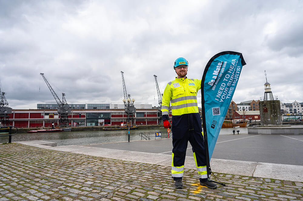 Chris, a construction health and safety lead based in Weston-Super-Mare, is running a half-marathon every week between 1 January until Suicide Prevention Day on 10 September 2025, spanning 36 weeks and covering 500 miles. He is wearing full PPE throughout, which includes protective glasses, gloves, a hard hat, full overalls and safety boots – while also carrying a flag bearing the words ‘Be a Mate. 500 miles for 500 lives. I need to hear your support, this hurts!’