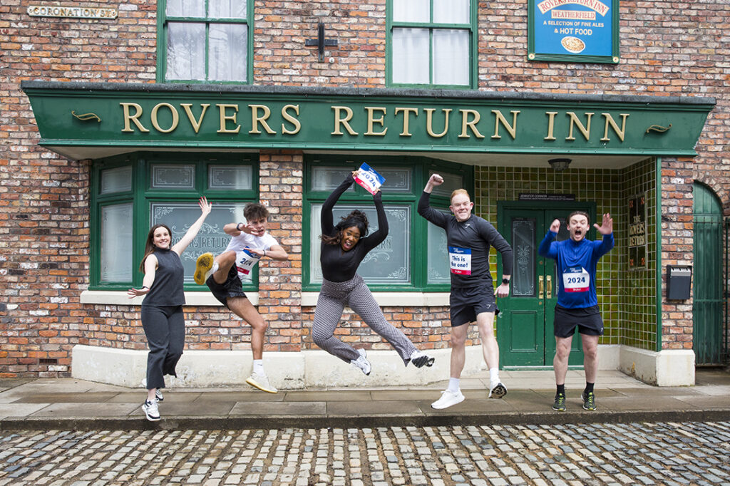 Heading from the cobbles to the Portland Street start line are a group of Corrie stars. This year we’re pleased to welcome Harriet Bibby, Calum Lill, Adam Hussain, Peter Ash, Elle Mulvaney, Channique Sterling Brown, Colson Smith, and Luca Toolan.