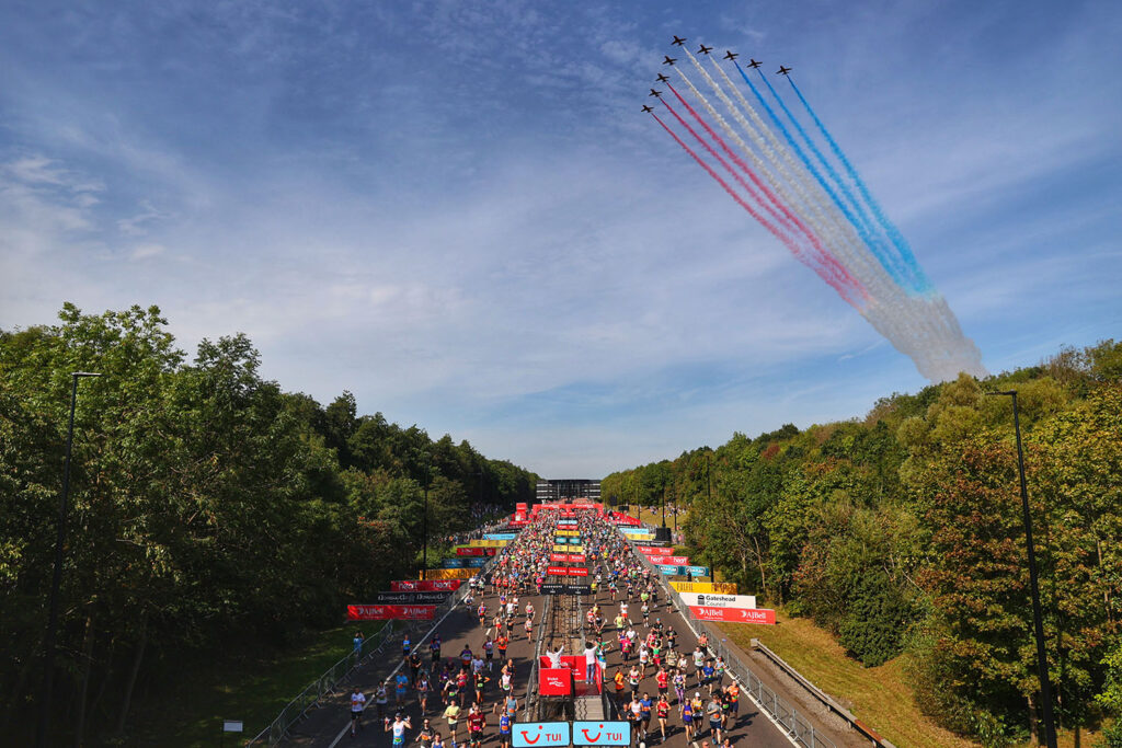 On the backdrop of clear blue skies, the Red Arrows streaked across the sky in perfect harmony. We watched from the finish line – the crowds heard the roar of the jets coming in and quickly turned to watch them soar overhead, looping and twisting gracefully over the coast at South Shields. You might have seen them at another point on your run, maybe as they passed over the start line? If not, take a look at this shot!